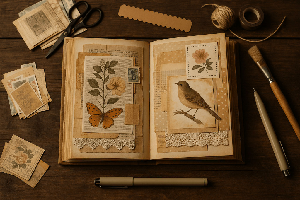 Viele verwenden bewusst recycelte Materialien – das passt zum nachhaltigen DIY-Gedanken des Junk Journals.